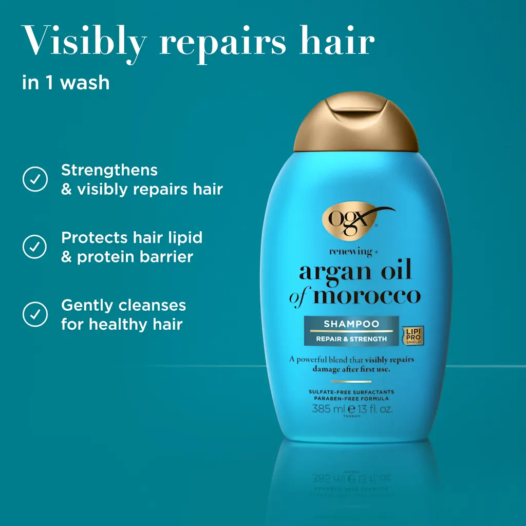 Repair & strengthen dry, damaged hair with OGX Renewing + Argan Oil of Morocco Shampoo. Argan Oil of Morocco shampoo from the #1 Hair Repair Brand*. Our new & improved formula protects hair from excessive loss of lipids & proteins which creates frizz & breakage. Now with Lipi Pro Shield™ Technology, the shampoo provides 2x more protein & lipid protection** for healthy hair. This shampoo with a citrus-fresh, floral-green, & woody scent repairs dry, damaged strands with a powerful blend that helps visibly repair damage after the first use. Apply to wet hair, massage into a lather, rinse & follow with an OGX conditioner. It has been carefully formulated to be without sulfated surfactants, parabens, phthalates, microplastics & dyes.