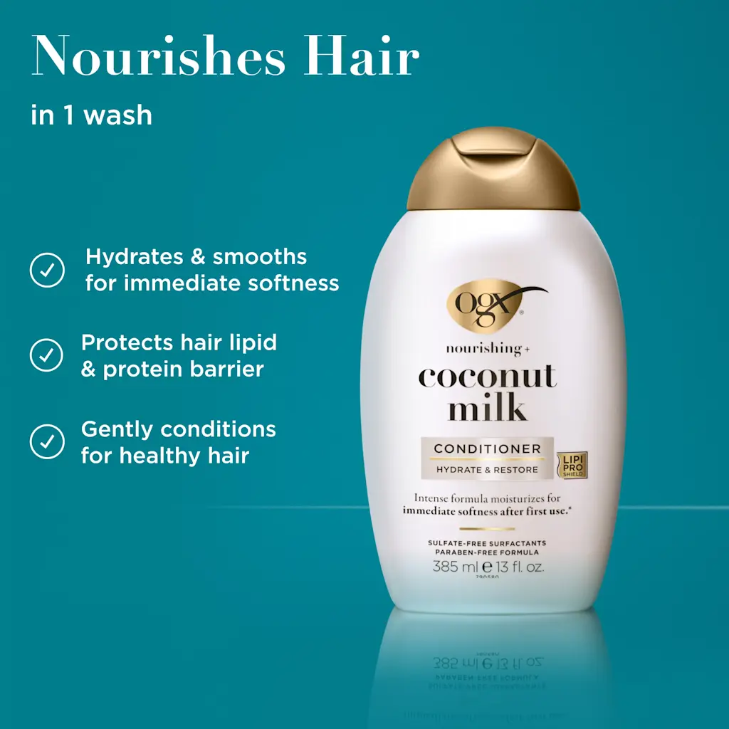 OGX Nourishing + Coconut Milk Conditioner This conditioner is positioned as a hydrating and restoring product from the #1 Hair Repair Brand*.